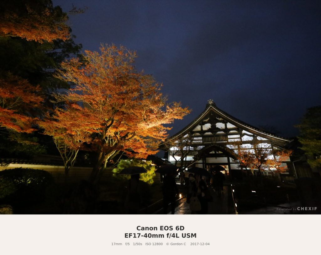 こちらは京都の寺院で行われた夜間ライトアップを、Canon EOS 6Dで手持ち撮影した一枚です。撮影設定はEF17-40mm f/4L USMの焦点距離17mm、F5.0、シャッタースピード1/50s、そしてISO 12800。かなりの高感度設定ですが、あえてこの値が選ばれたのには理由があります。