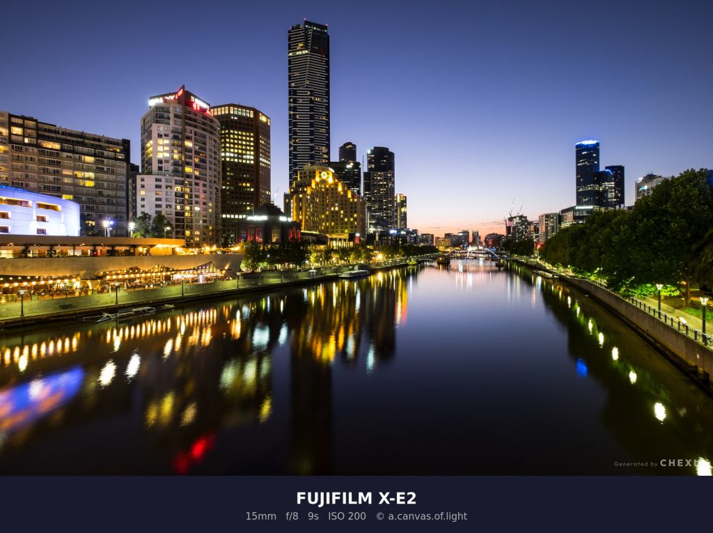 メルボルンのブルーアワー都市夜景 FUJIFILM X-E2 EXIFフレーム付き