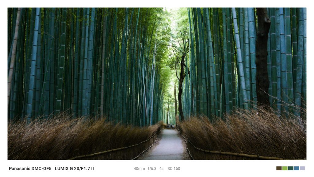 上の作例は京都・嵐山の竹林をPanasonic DMC-GF5とLUMIX G 20mm F1.7 II(35mm換算40mm)で撮影したもの。f/6.3まで絞ることで手前の竹垣から奥の消失点までシャープに描写し、シャッター速度4秒の長時間露光で竹林全体を静謐に捉えている。ISO 160の低感度設定がノイズのない滑らかな描写を支えている。
